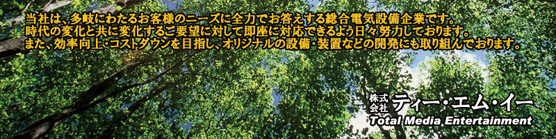 株式会社TMEは、薩摩川内市に本社をおく会社です。業務内容は多岐に渡りますが、ただいま社内組織の育成と成長が急務となっています。競争社会に勝ち残る為、オリジナル製品の開発を推進していきたいと思います。当社では電気工事部・リース部・店舗管理部の3部署で運営しており、特に電気工事部では通常の電気工事の他に、電気制御盤を扱っております。これは現在養鶏場で機械化をすすめ、それに伴う制御盤の部分です。この制御盤は汎用性がありますので格分野で応用が期待されます。例えば農業ビニールハウスの温度管理や照明管理に当たります。センサーで感知された情報はパソコンに反映され予め設定された温度や照明に自動的に調整されます。人件費を節約し、労力の軽減に大きく貢献致します。その他に弱酸性水生成装置の開発・管理も行っております。弱酸性水とは、扱いに危険を伴っていた除菌液に代わり、安全性を確保しつつ除菌力も同等以上を備えた、次世代の除菌液として注目されている除菌液です。この弱酸性水を生成するには細かい分量を量っての希釈や、管理の手間がかかっていました。本装置は、その手間を可能な限り自動化し、pHの自動調整機能などにより安全性も確保しつつ大量の弱酸性水が生成できる装置です。その安全性から、農場・食品加工場・医療施設等、色々な場所で活躍できます。今後も前述の製品の開発・その他部署の管理運営共にお客様に満足を提供できるよう日々努力してまいりますので、よろしくお願いします。